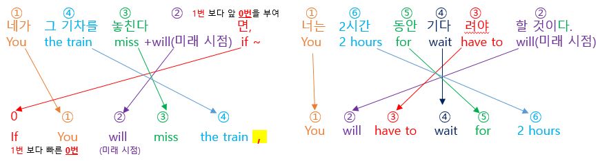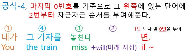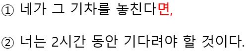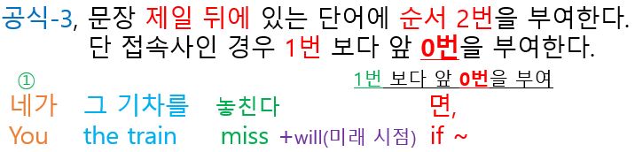 둘째는 각각의 단어를 "영어작문 공식"에 따라서 단어의 나열 순서를 정해줍니다. 즉, 각각의 단어에 1부터 9까지의 숫자를 활용해서 순서를 정해 줍니다. 주의 사항 이번 포스팅에는 2개의 문장을 연결하는 접속사 (만일 ~면( if)가 있는 종속절이 있습니다. 전체적으로 작문을 해야할 문장이 길어 보이지만 콤마(,) 앞뒤를 각각의 문장으로 구분해서 독해하면 오히려 더 간단합니다. 각각 2개의 문장 작문한 후에 2개의 문장을 하나로 연결해주면 끝난다. 먼저 콤마(,) 앞뒤로 2개의 문장을 나누어 보면 다음과 같다.