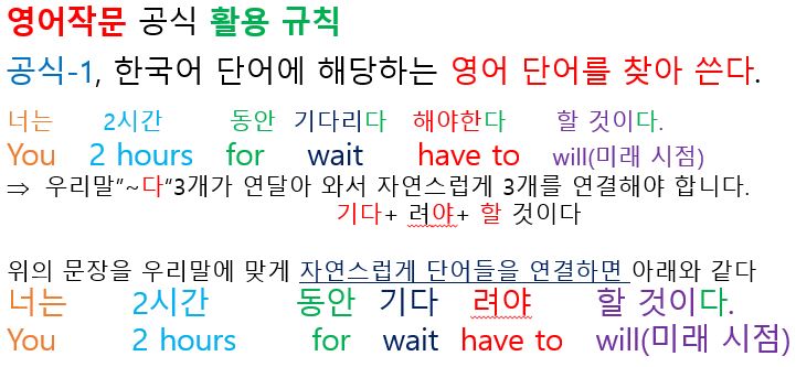 결론, "영문법이 필요 없는 영어작문 공식"을 2개의 문장을 작문해 보았습니다. 이 2개의 문장을 가지고 본인이 작문하고자 하는 문장을 완성하기 위해서는 첫번째 문장 뒤에 콤마(,)만 끼워주고 2번쩨 문장을 가져다 놓으면 작문하고자했던 영어 문장이 최종적으로 완성됩니다.