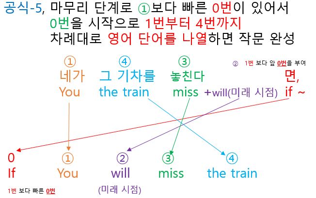 둘째는 각각의 단어를 "영어작문 공식"에 따라서 단어의 나열 순서를 정해줍니다. 즉, 각각의 단어에 1부터 9까지의 숫자를 활용해서 순서를 정해 줍니다. 주의 사항 이번 포스팅에는 2개의 문장을 연결하는 접속사 (만일 ~면( if)가 있는 종속절이 있습니다. 두번째 문장의 작문이 완성되면 먼저 작문한 문장 뒤에 바로 가져다 놓으면 최종 영어 작문이 완성입니다.