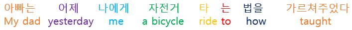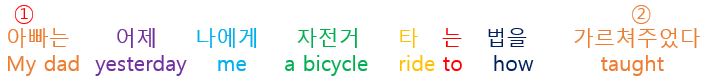 우리말 "~다"로 끝나는 단어가 올 경우 "~다"를 행하는 사람은 항상 그 행동하는 단어 앞에 온다.