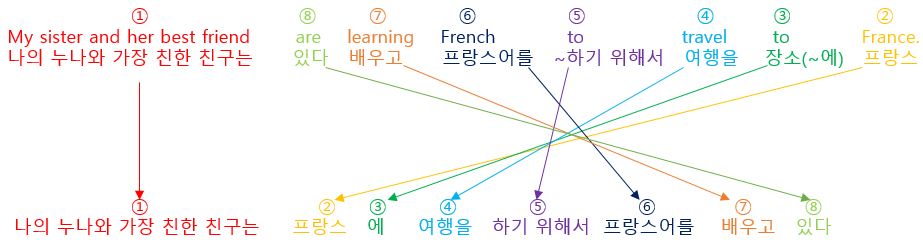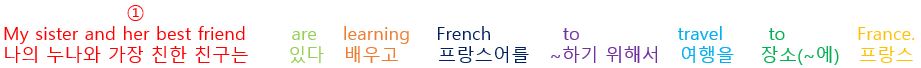 나의 누나와 가장 친한 친구는 있다 배우고 프랑스어를 ~하기 위해서 여행을 장소(~에) 프랑스