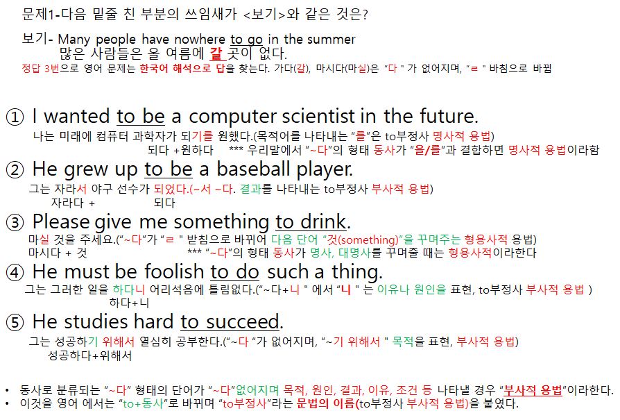 위 문제에서 보았듯이 영어 “to부정사”의 용법을 고르는 문제는 영어 자체에서 문제를 찾는 것이 아니라, 우리말 해석을 기준으로 정답을 선택합니다. 많은 학생들이 실수하는 것이 영어에서 비슷한 형태를 선택하려할 때 자꾸 틀린 답을 고르는 이유입니다.