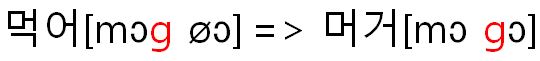 However, in the next word "먹어(Eat)," the consonant "ㄱ[g)" is pronounced "머거[mo-geo]" by moving to the consonant "o" position when a person reads it. the consonant "o" loses its original sound "ng" and the consonant "bottom consonants" sound, which is used in the preceding syllable, comes.