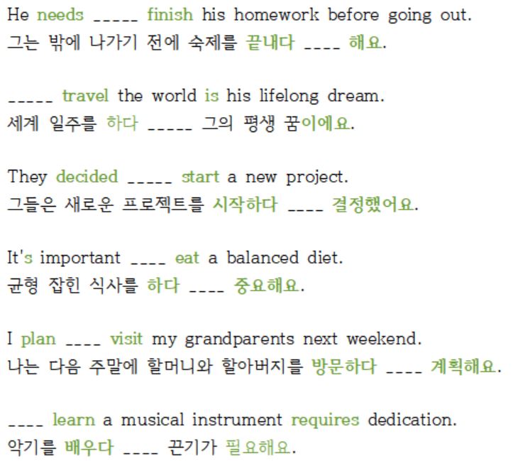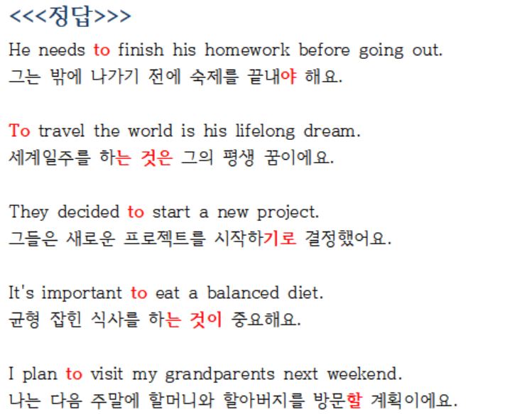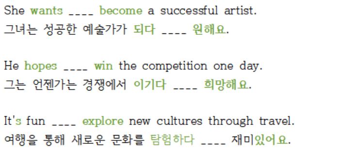 이렇게 예문까지 완성해 보았습니다. 여러분이 영어의 ‘To부정사’라는 문법을 이해하기 위해서는 본인의 모국어에서 한 문장 안에 2개 이상의 동사가 있을 때 2번째 동사는 어떻게 다른 단어와 연결 되는지를 이해하세요. 그럼 영어의 ‘To부정사’가 왜 필요한지, 스스로 완벽한 이해를 성취할 수 있습니다.
