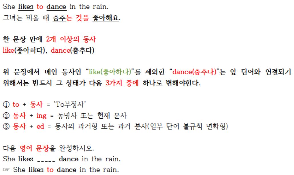 ‘To부정사(to+동사)’라는 이름을 붙여 주는 이유는 “한 문장 안에서 동사가 2개 이상”이 중복이 될 경우 반드시 ‘메인 동사(주어 바로 뒤에 있는 동사)’ 하나를 제외한 모든 동사는 그 형태가 다음 3가지 중에 하나로 변해야 한다. 그 중에 하나가 바로 ‘To부정사(to+동사)’이다.